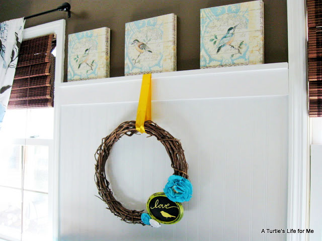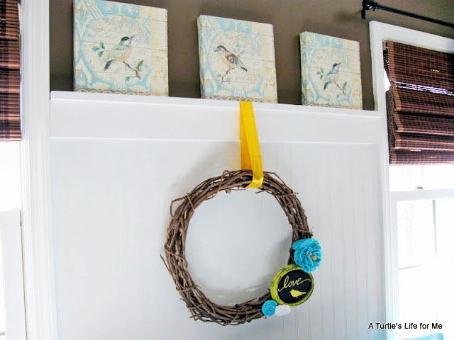 I showed the wreath that I made for a quarter over here and I just stapled the ribbon onto the trim. The bird pictures we had before (a Christmas Tree Shop find) and they’re just sitting on the ledge.