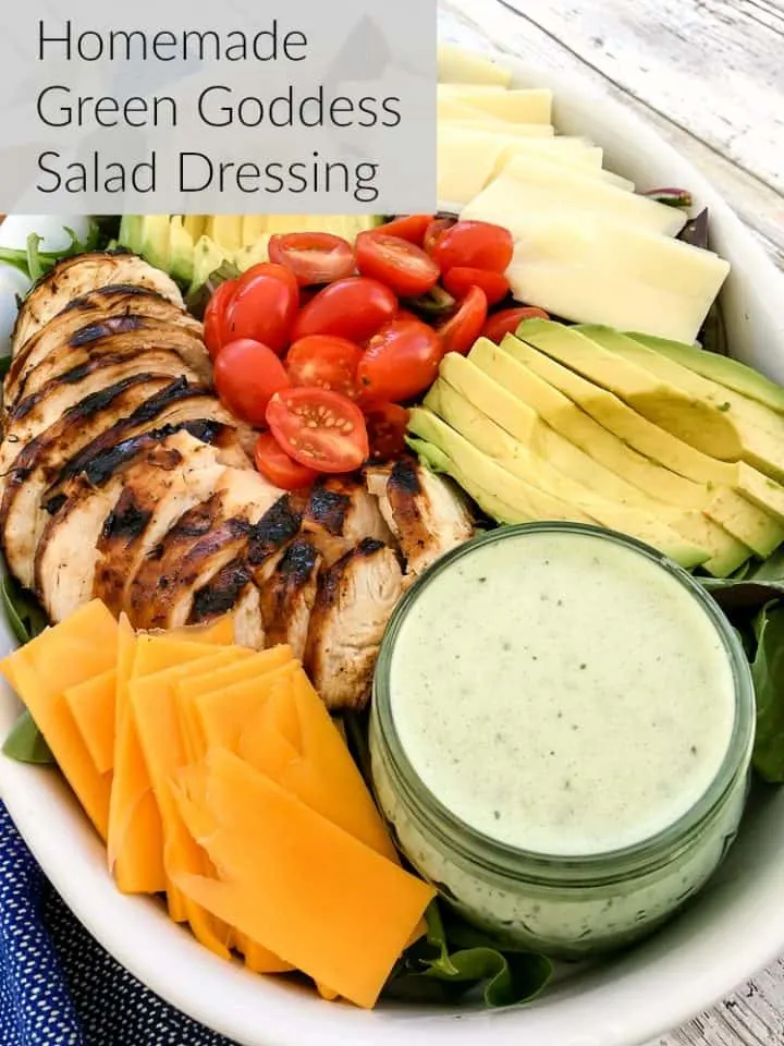 This Healthy Green Goddess Salad Dressing Recipe has a yogurt base and is packed with fresh herbs. It works well as a veggie dip too!