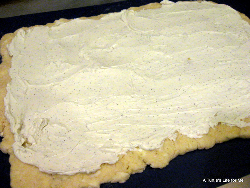 Take the vanilla cream cheese mixture and carefully spread over rectangle.