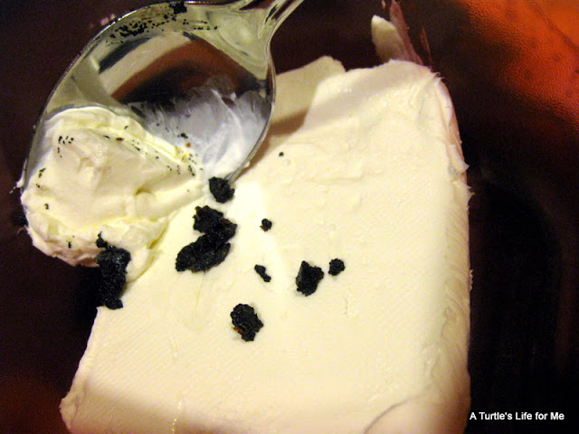 For the cream cheese filling, mix a block of softened cream cheese with the good stuff from another vanilla bean (I did this ahead of time as well so the flavors could combine).